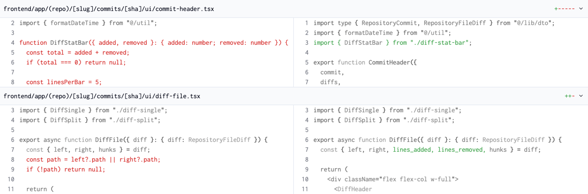 And finally difftastic can also be quite slow, which means that we had to employ a two-tiered suspense paradigm to stream content gradually for latent pages, but also avoid showing a loading indicator for pages that load quickly.