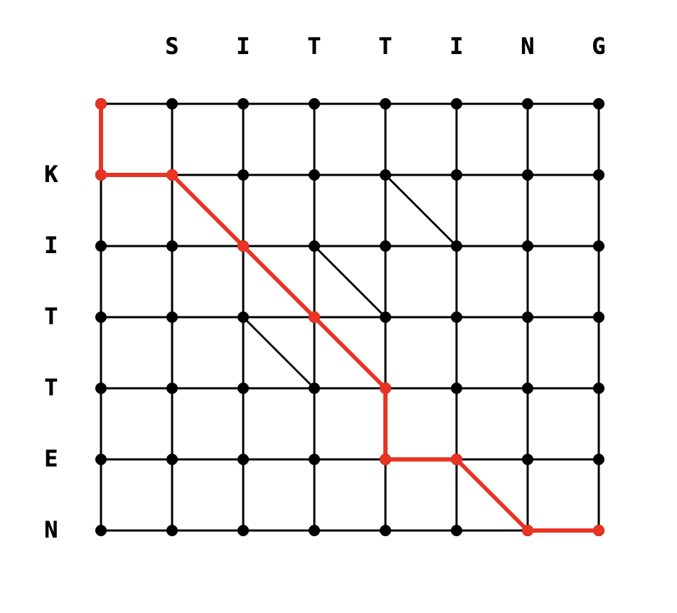 Before we talk about other diff algorithms, it’s worth establishing that there are often many valid diffs for a given pair of strings. For example, rather than remove K first and then add S in the example above, we could’ve done the opposite: add S and then remove K.